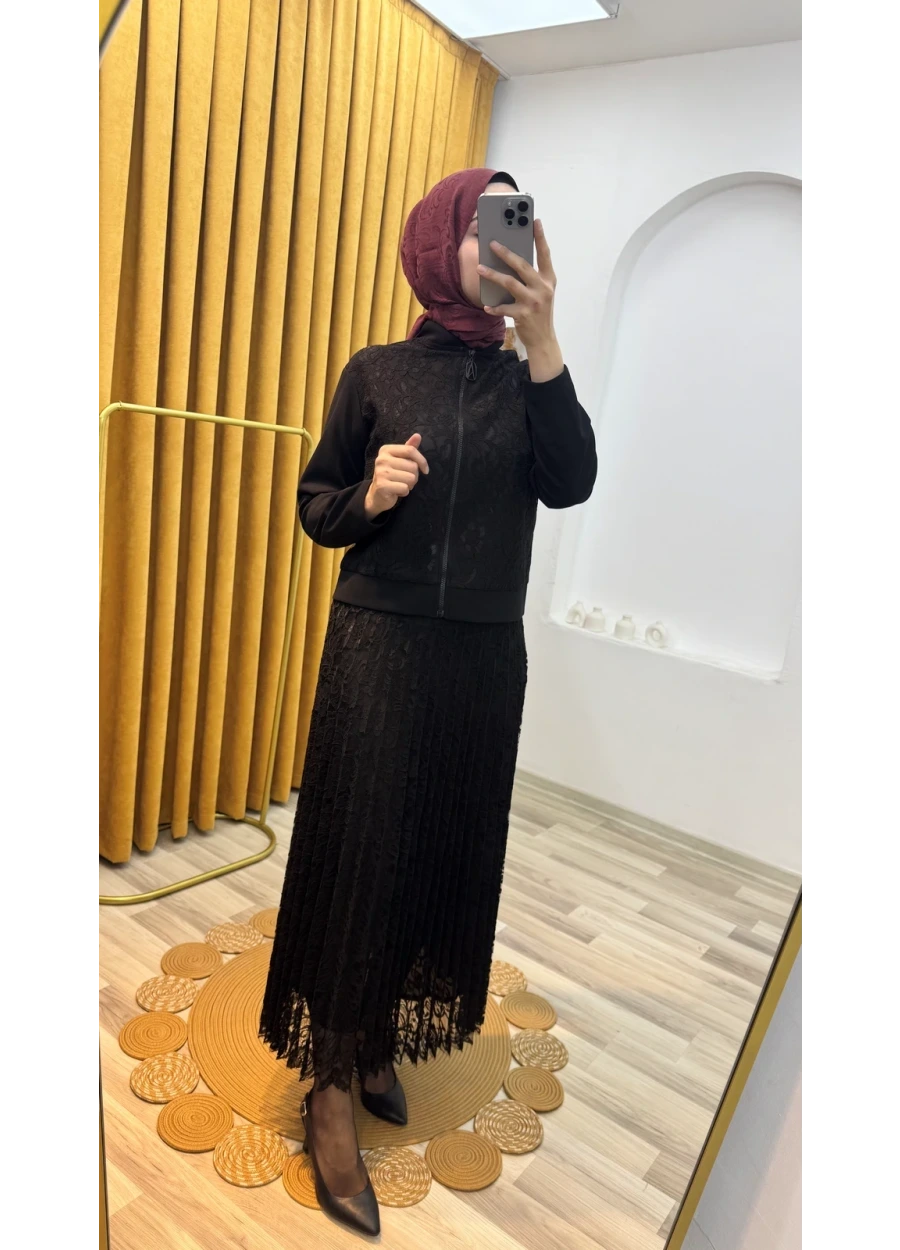 Dantel detaylı tasarım, klasik etekli takımı modern tesettür trend stiline dönüştürür. Üst bölümde ve kol detaylarında kullanılan dantel işlemeler, takıma zarif bir hava katar.