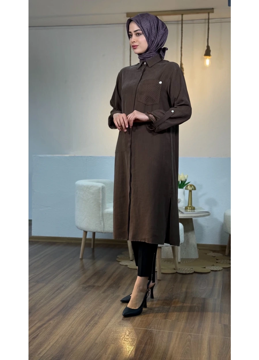 File detaylı uzun tunik, klasik tunik modellerine modern dokunuşlar katan özel bir tasarımdır. Kol, etek ucu veya yan panellerde kullanılan file detaylar, ürüne hem hareket hem de estetik bir görünüm kazandırır.