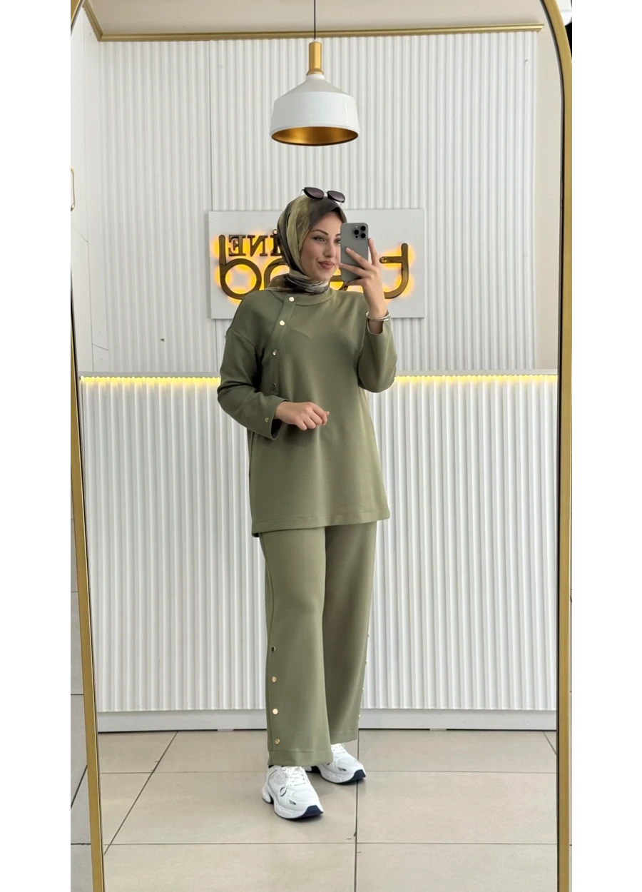 Armine Trend Yakadan Düğme Detaylı Pantolonlu Takım, tesettür kombinlerinin merkezinde yer alabilecek güçlü bir parçadır.
